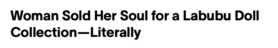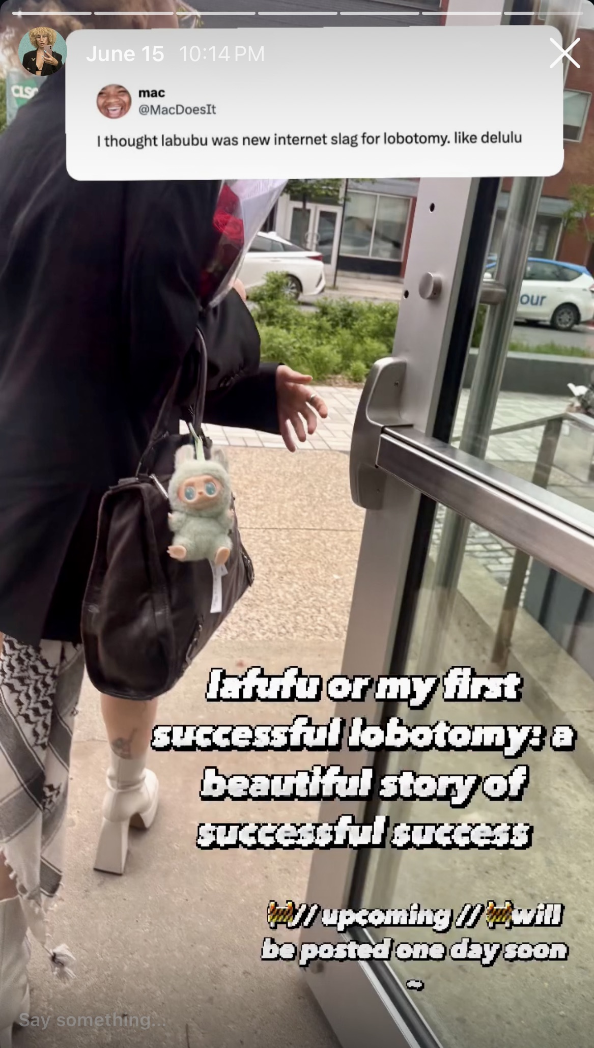 Someone said “i tought labubu was an internet slang for lobotomy, like delulu”. It is, je suis deep inside cette lobotomie collective. J’ai un lafufu et un autre en version miniature et je les aime de tout mon cœur, comme la prunelle de mes yeux. J’en suis obsessed à l’unisson avec toutes les personnes lobotomisées par ces jouets, car rien n’est plus commun qu’une lobotomie partagée.